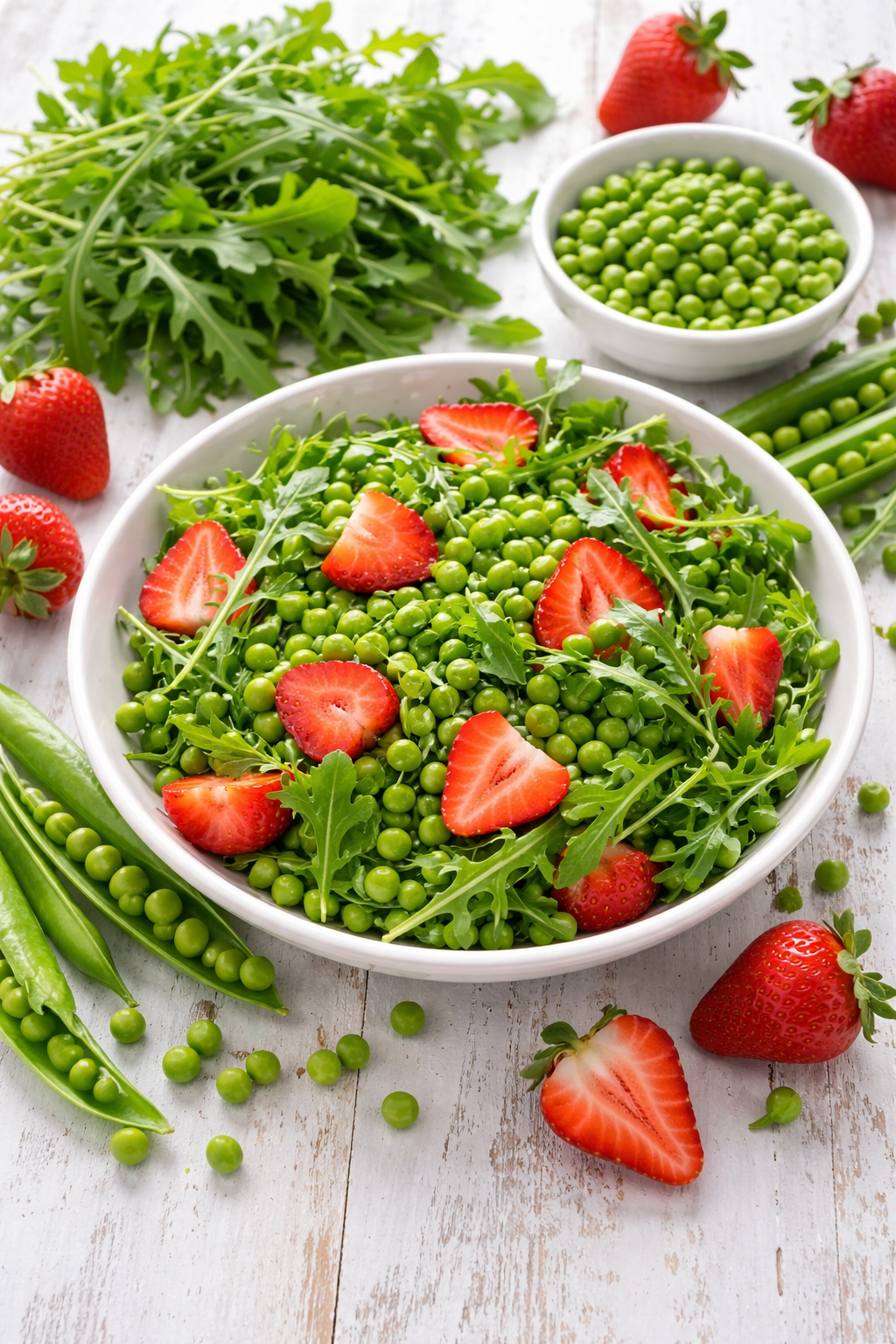 Rucola e piselli con fragole e pinoli